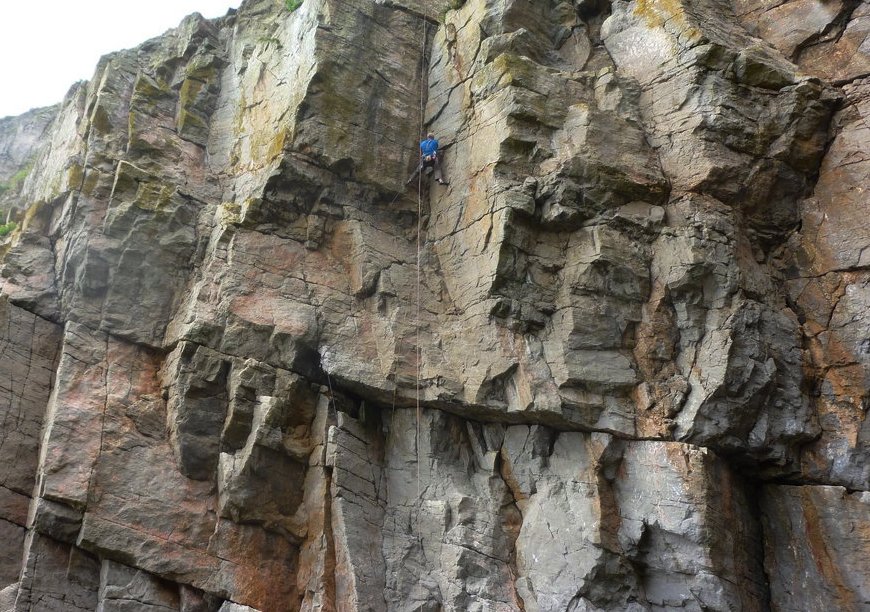 A fine route. Climb a groove below a small jutting prow under the lowest line of overhangs, to the horizontal break at 4m. Climb leftwards to below the bulging groove, then traverse left to reach easy ground at the top of the corner of Skylark. Either abseil off old peg runners and a block on the left, or finish up Skylark.
